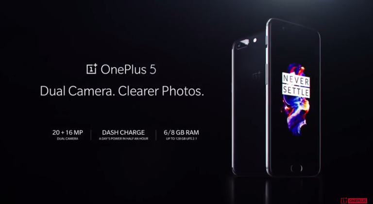 All the key OnePlus 5 specifications were shown off in a single slide by the company in the live-streamed video. As the image above shows, the smartphone has a 5.5-inch full-HD Optic AMOLED screen, and packs the Snapdragon 835 processor, with top clock speed of 2.45GHz. You can look forward to two OnePlus 5 variants: 6GB RAM + 64GB storage, and 8GB RAM + 128GB storage. The ceramic fingerprint sensor, which has been moved to the front, can unlock the device in 0.2 seconds. OnePlus 5 battery capacity is 3300mAh, 100mAh smaller than that of the OnePlus 3T.